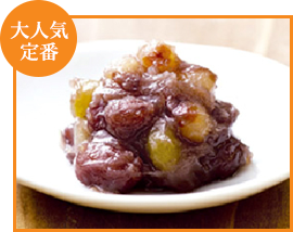 累計生産 6,000 万個製造大阪土産の定番品『五色どらやき』使用のあんこです。豆の表面を磨いて、舌触りを邪魔する胚芽分などを捨てたとても贅沢なあんこです。口溶けなめらかなあんこの中に、ほっくりと炊きあげた白小豆、金時豆、虎豆、うぐいす豆、小豆の鹿の子を一緒に炊きあげています。